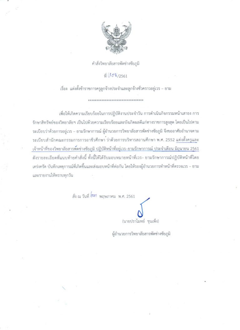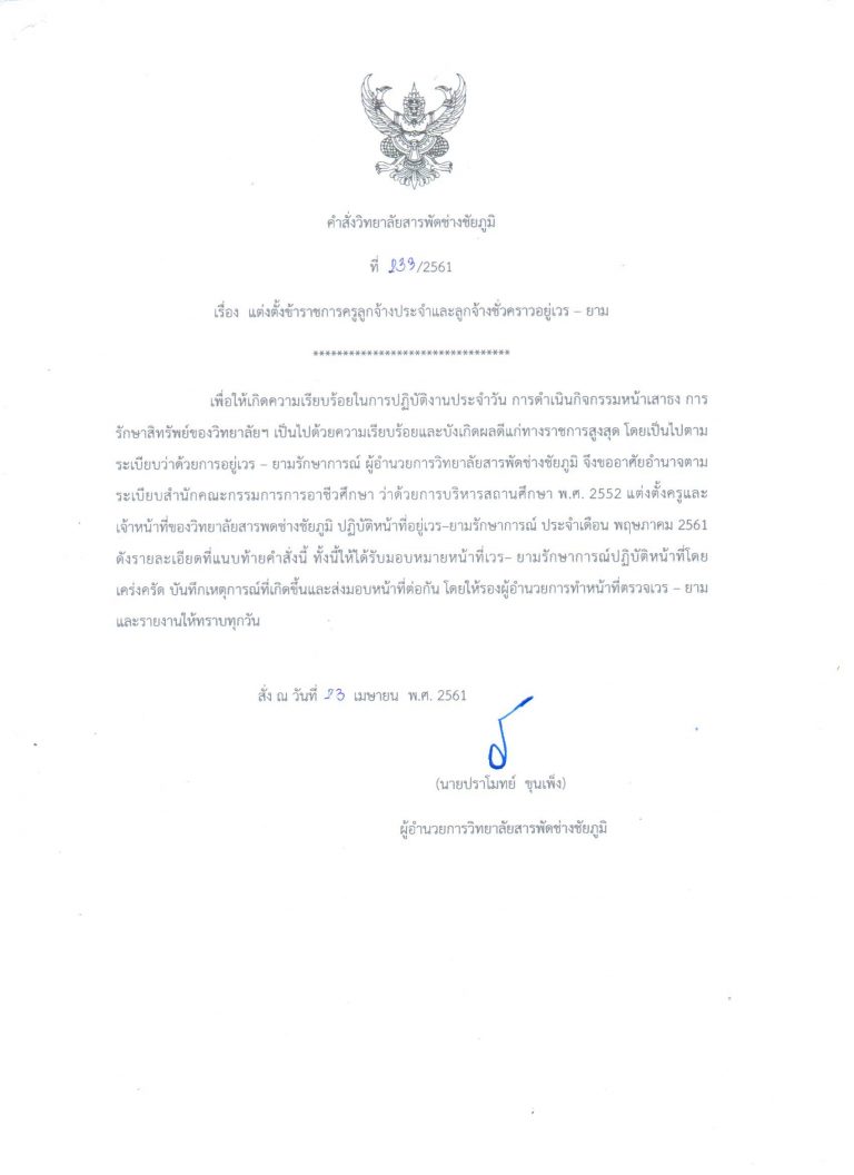 คำสั่งวิทยาลัยสารพัดช่างชัยภูมิ เรื่อง มอบหมายหน้าที่ให้ข้าราชการครู พนักงานราชการ ลูกจ้างประจำ ลูกจ้างชั่วคราวบุคลากรทางการศึกษา ปฏิบัติหน้าที่ราชการ ประจำปีการศึกษา 2561