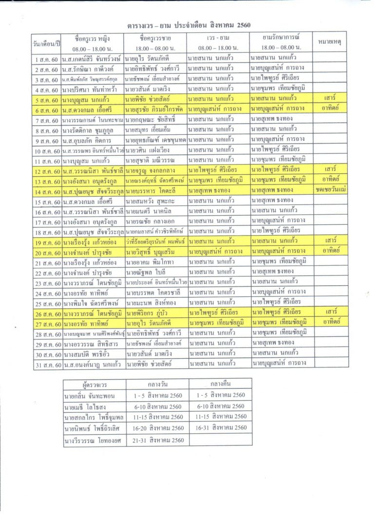 คำสั่งแต่งตั้งข้าราชการครู ลูกจ้างประจำ พนักงานราชการ และลูกจ้างชั่วคราวปฏิบัติหน้าที่อยู่เวร – ยาม ประจำเดือนสิงหาคม 2560