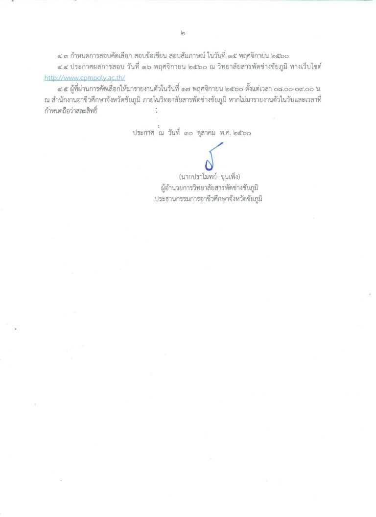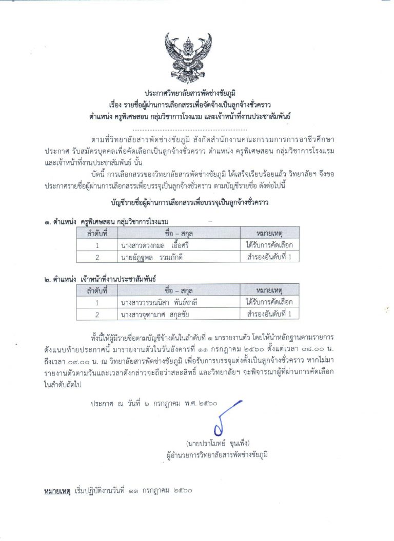 ประกาศวิทยาลัยสารพัดช่างชัยภูมิ เรื่อง รับสมัครบุคคลเพื่อคัดเลือกเป็นลูกจ้างชั่วคราว ตำแหน่งครูอัตราจ้าง แผนกการโรงแรม และแผนกอาหารและโภชนาการ