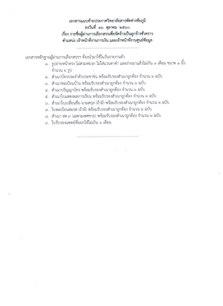 ประกาศรายชื่อผู้ผ่านการเลือกสรรเพื่อจัดจ้างเป็นลูกจ้างชั่วคราว ตำแหน่ง เจ้าหน้าที่งานการเงิน เจ้าหน้าที่งานศูนย์ข้อมูล