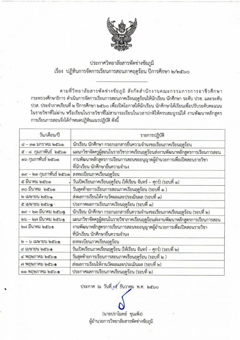 ปฏิทินการจัดการเรียนการสอนภาคฤดูร้อน ปีการศึกษา ๒/๒๕๖๐