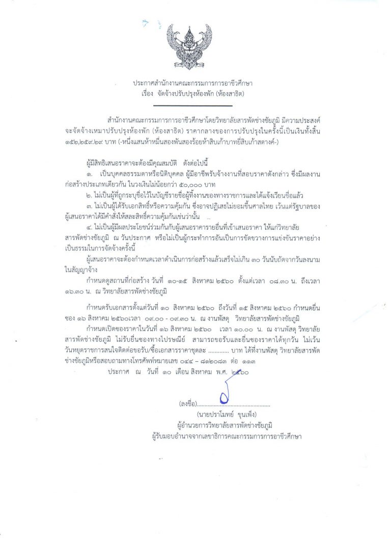 ประกาศจัดจ้างปรับปรุงห้องพัก (ห้องสาธิต)