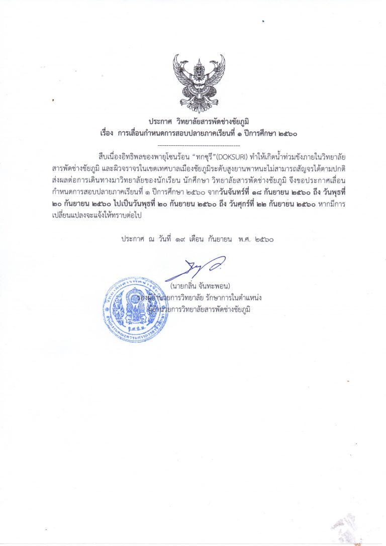 ประกาศ เลื่อนกำหนดการสอบปลายภาคเรียนที่๑ ปีการศึกษา ๒๕๖๐