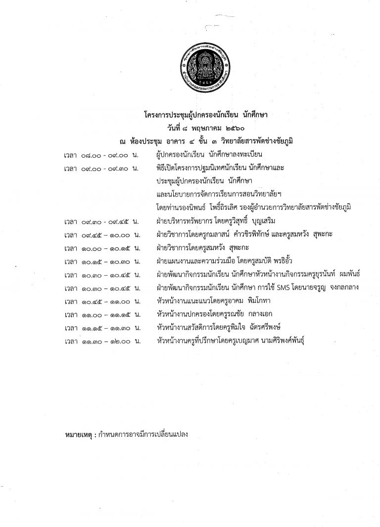 กำหนดการประชุมผู้ปกครองนักเรียน นักศึกษาใหม่ ประจำภาคเรียนที่ 1/2560 ในวันที่ 8 พค. 60