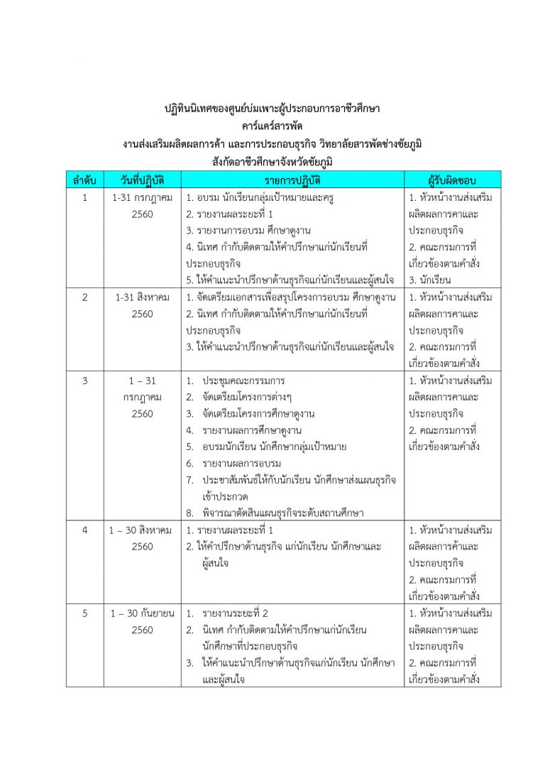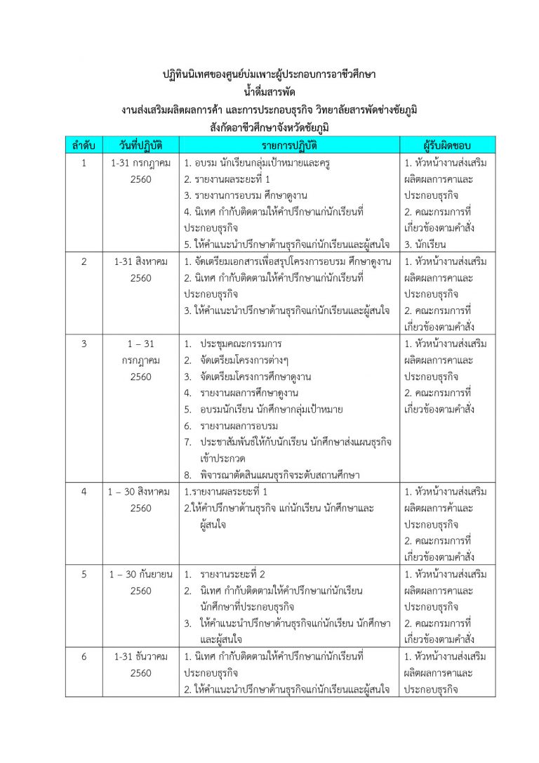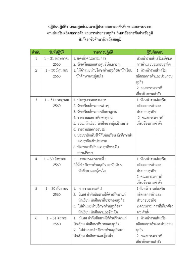 ปฏิทินปฏิบัติงานของศูนย์บ่มเพาะผู้ประกอบการอาชีวศึกษาแบบครบวงจร งานส่งเสริมผลิตผลการค้า และการประกอบธุรกิจ วิทยาลัยสารพัดช่างชัยภูมิ สังกัดอาชีวศึกษาจังหวัดชัยภูมิ