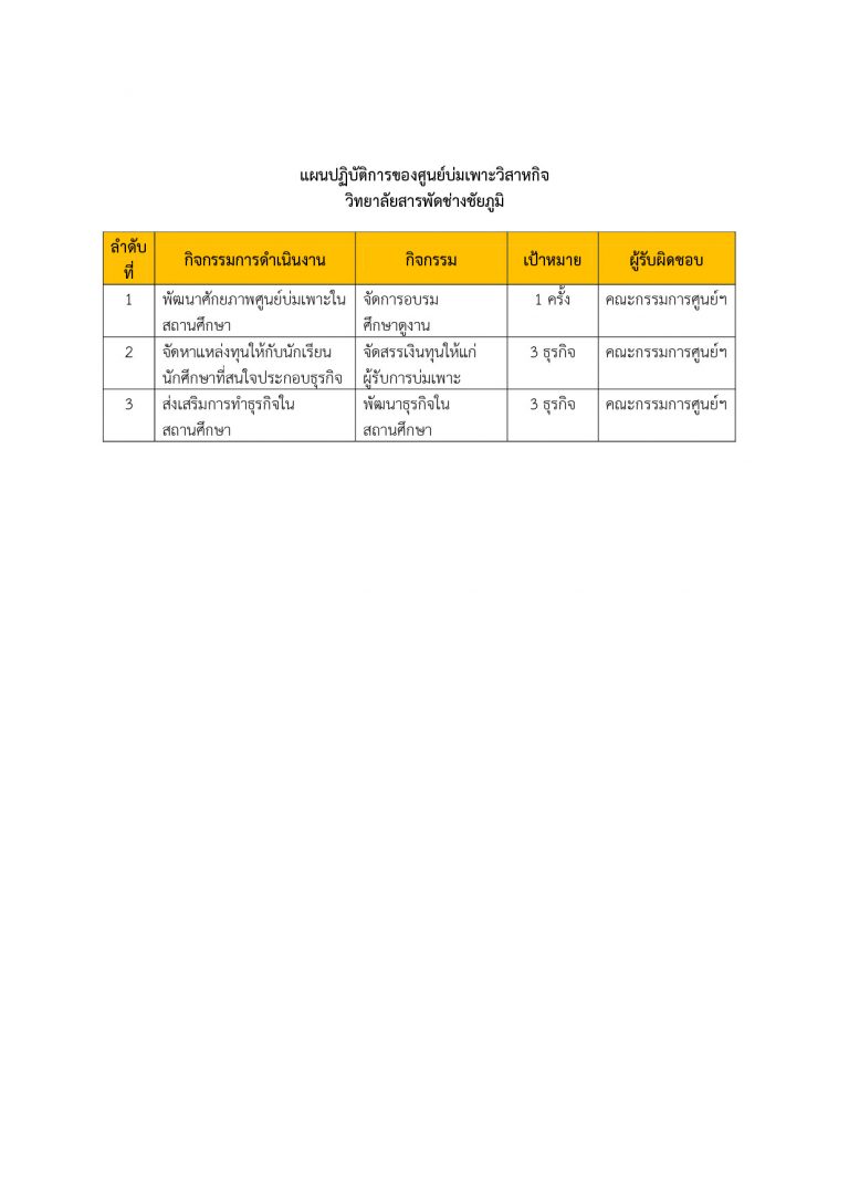 แผนปฏิบัติการของศูนย์บ่มเพาะวิสาหกิจ วิทยาลัยสารพัดช่างชัยภูมิ